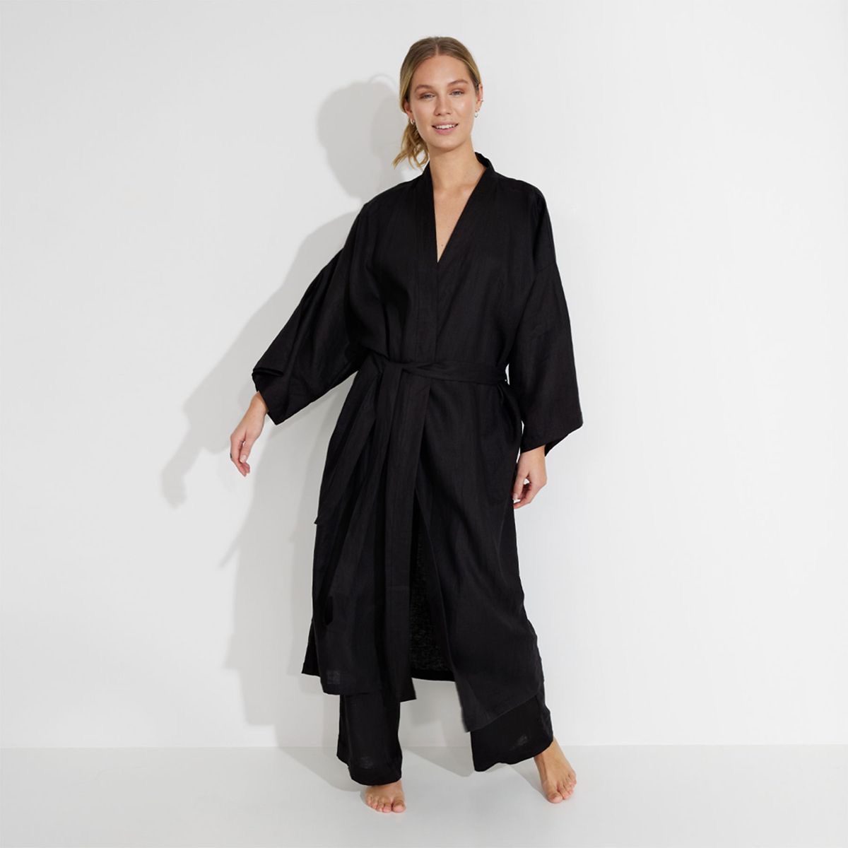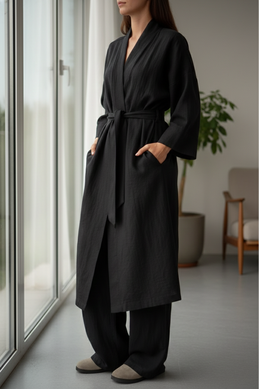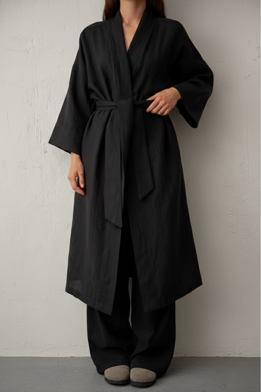 The elongated bathrobe features a fluid, structured drape, finished with a bold statement belt that adds definition and presence, while allowing versatile styling—worn open or cinched for a composed silhouette. Complementing it, the cotton-linen pant is designed with a slim elastic waistband, offering gentle comfort while maintaining a clean, refined profile.