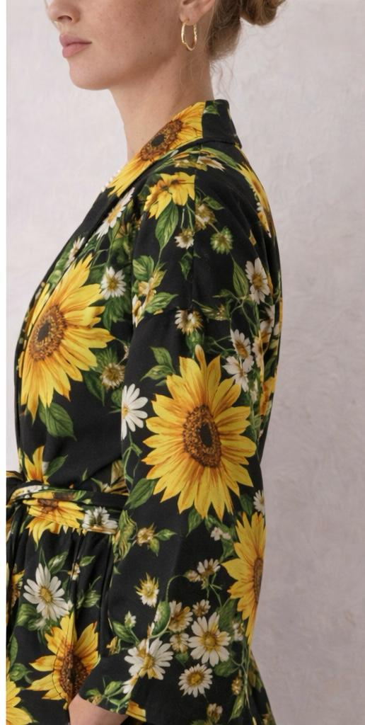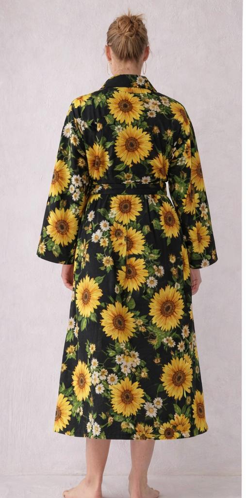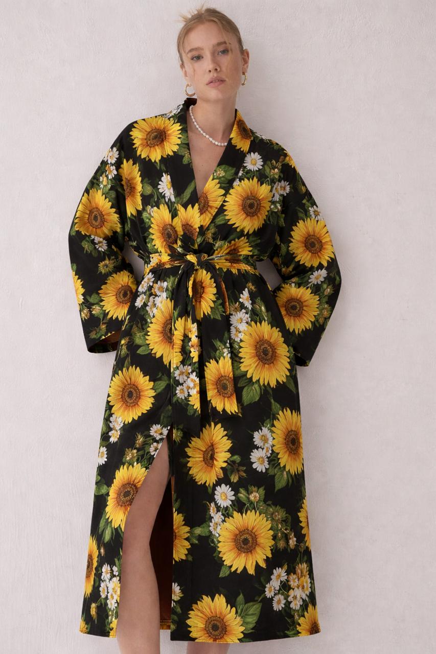 The bold sunflower print against the dark base adds a vibrant yet elegant touch, making it perfect for lounging, vacation wear, or layering over sleepwear.