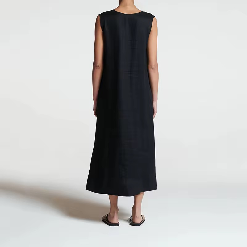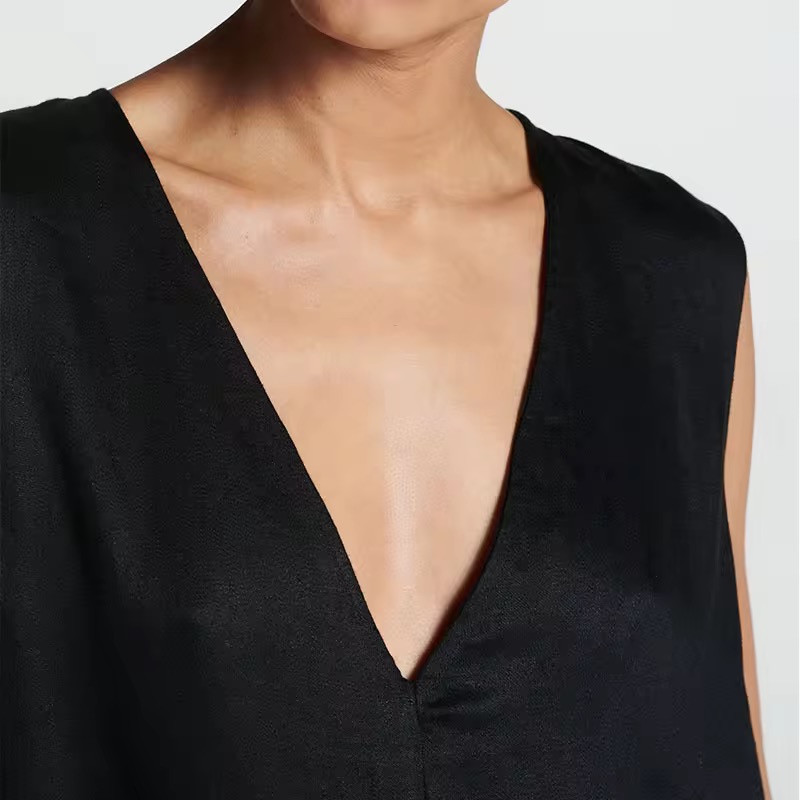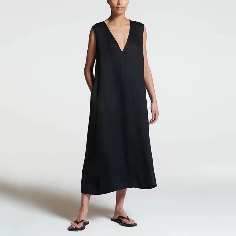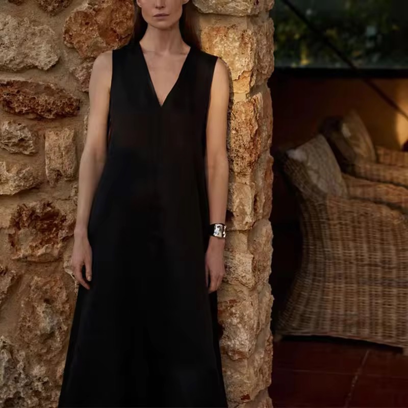 The relaxed A-line silhouette drapes beautifully over the body, while the deep V-neckline adds a subtle touch of sophistication. Its sleeveless design enhances ease of movement, making it perfect for warm days, travel, brunches, or understated evening styling.